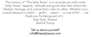 The Salty Texan–Bay Harbor neighbors Brett and Tracey Balcerak can hook you up with Frio coolers, shirts, caps, accessories, decals, etc. that proclaim your love for Texas and its saltwater coast